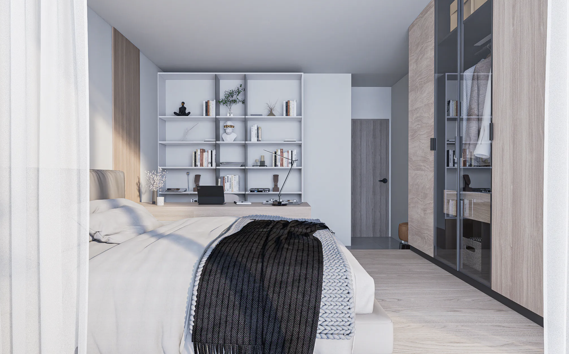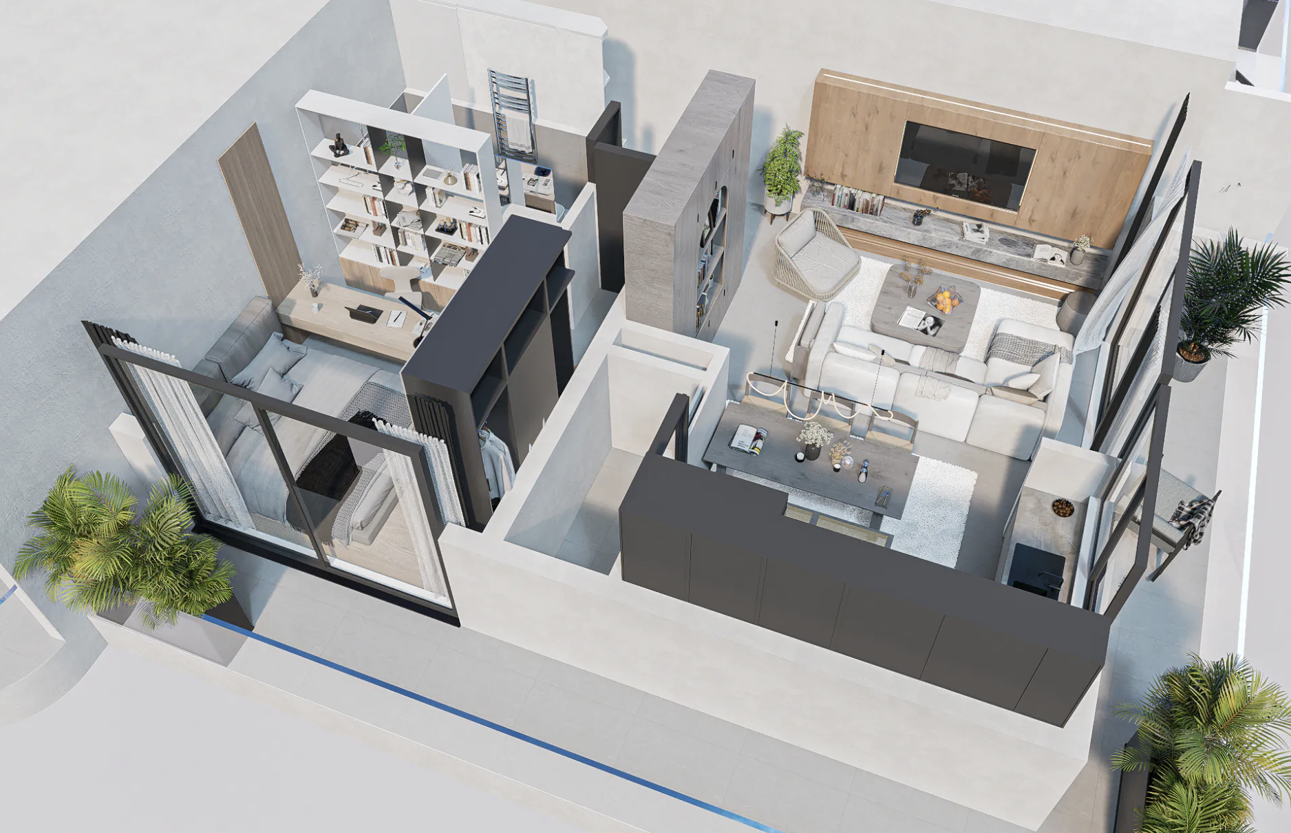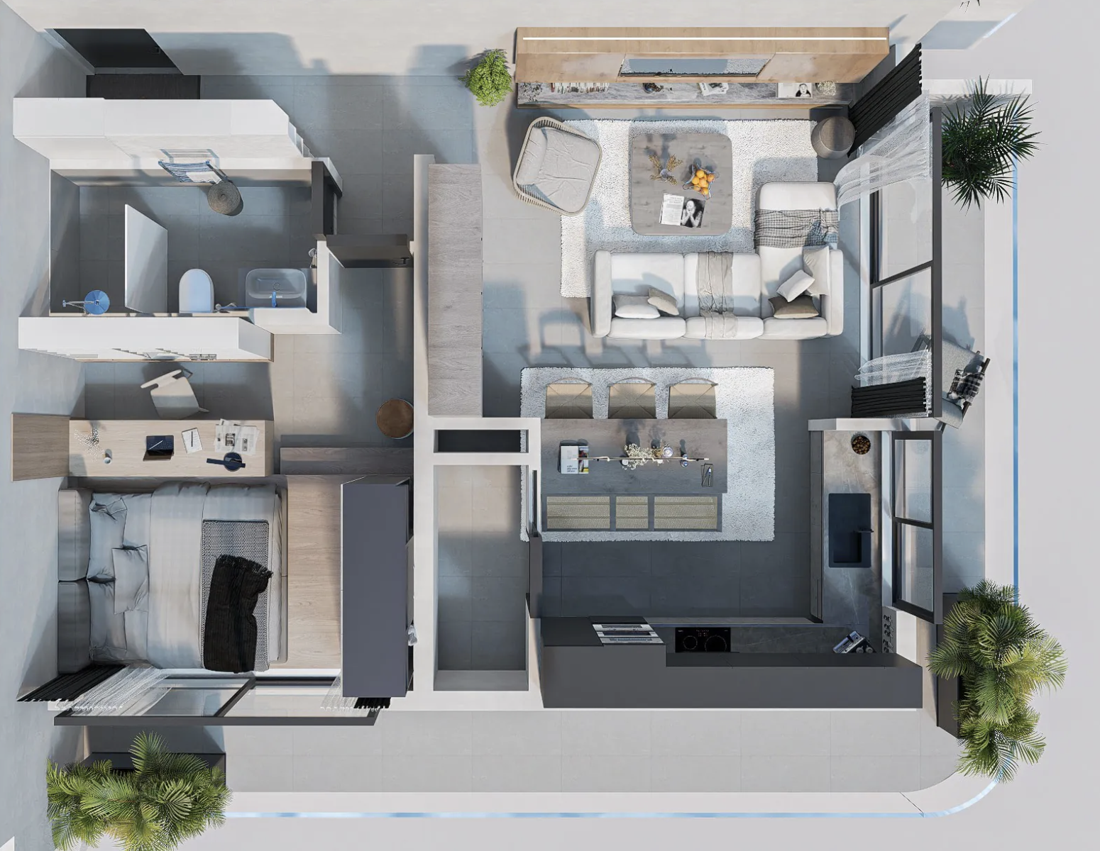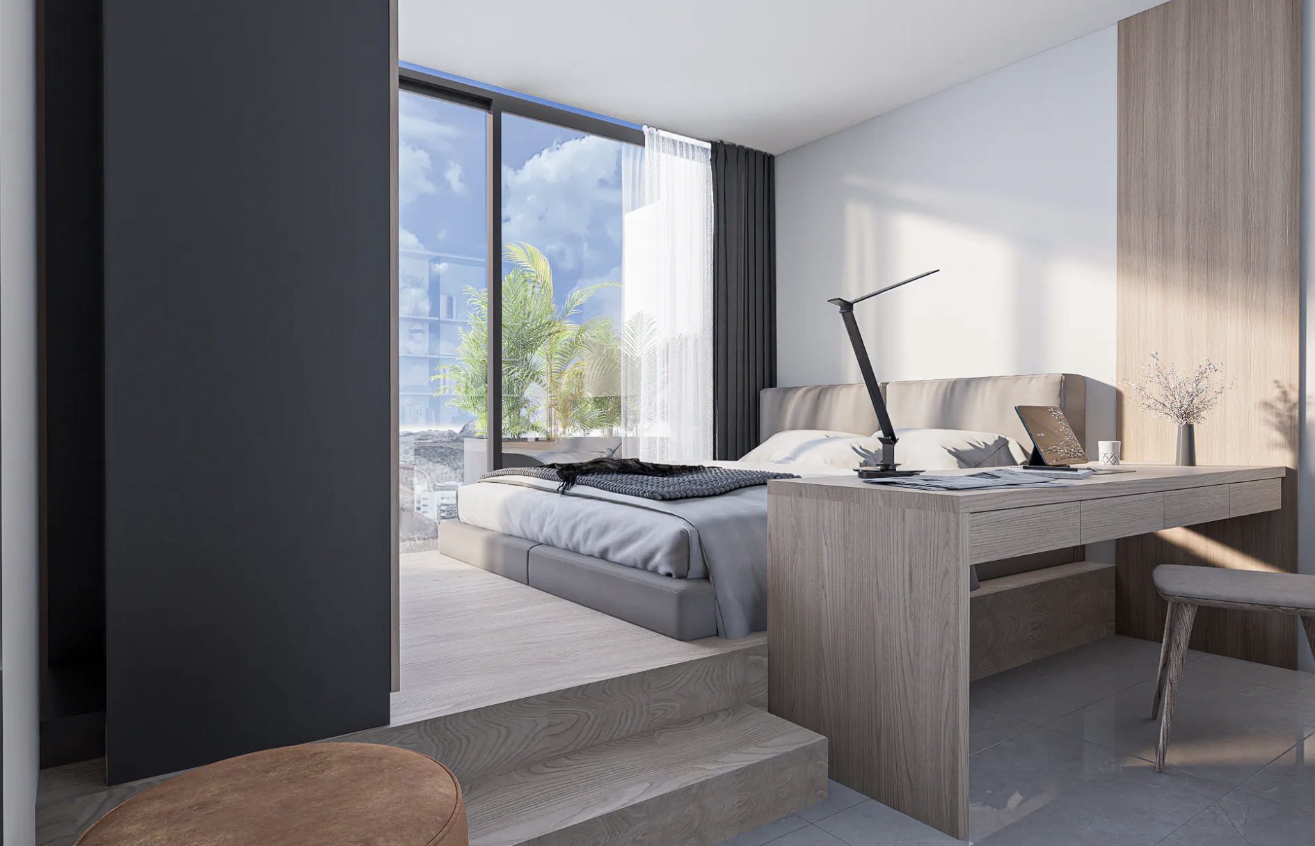 Set within DuarGema – House of Diaspora, this corner T1 faces east for gentle morning light and natural afternoon shade. Both the bedroom and living room open to a balcony overlooking the countryside, city and Atlantic, while the capital’s full amenities lie close at hand for effortless everyday living.
